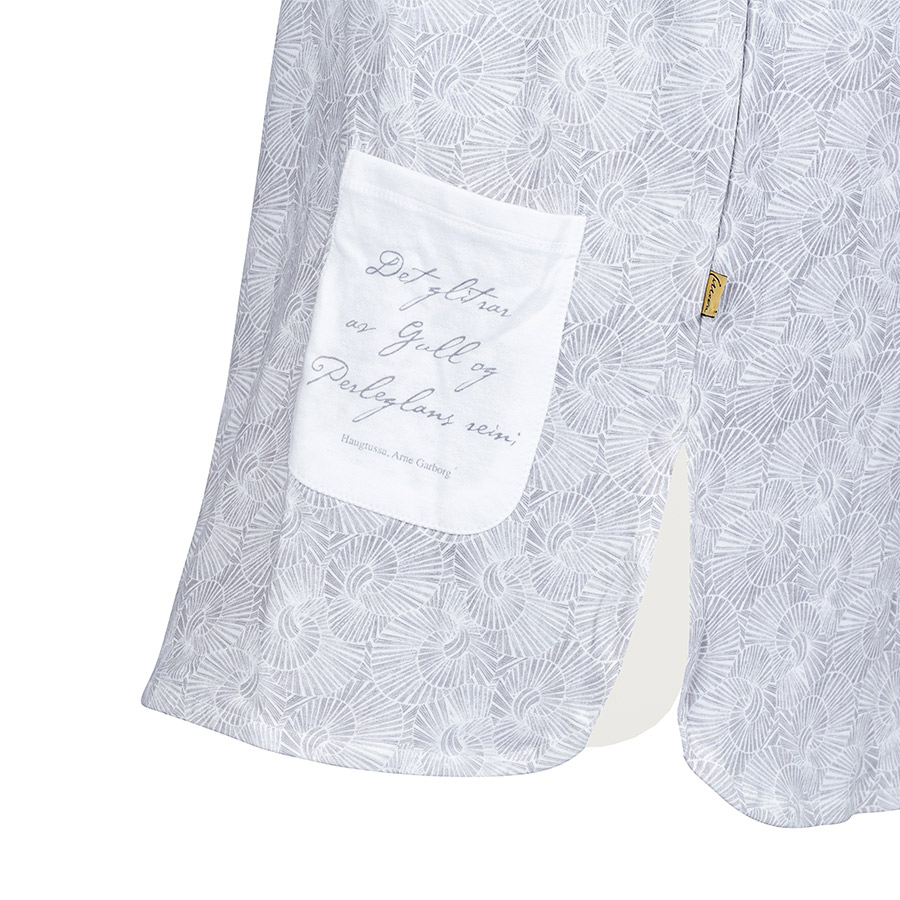 - En fin liten lomme i front, dekorert med et sitat fra Arne Garborg.