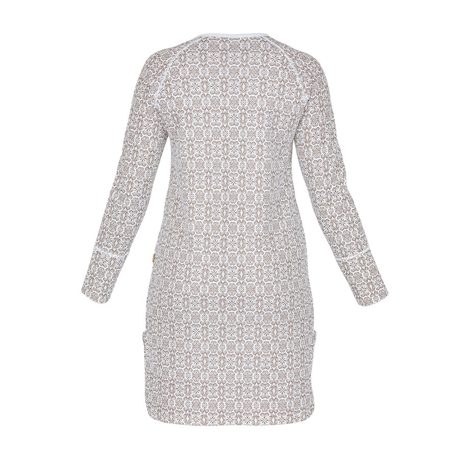 Det tradisjonelle Fjellstrikk-mønsteret representerer dagen, med hardt arbeid og fortjent fritid. Nattkjolen er en del av Lilleba sin Nordisk Drøm-kolleksjon, og du finner flere plagg til både voksne og barn i samme mønster.