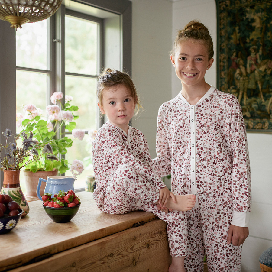 Erteblome-mønsteret peker på de siste øyeblikkene hvor solstrålende treffer vår vakre natur, når plantene gjør seg klare for å hvile etter dagens innsats. Pysjen er en del av Lilleba sin Nordisk Drøm-kolleksjon, og du finner flere plagg til både voksne og barn i samme mønster.