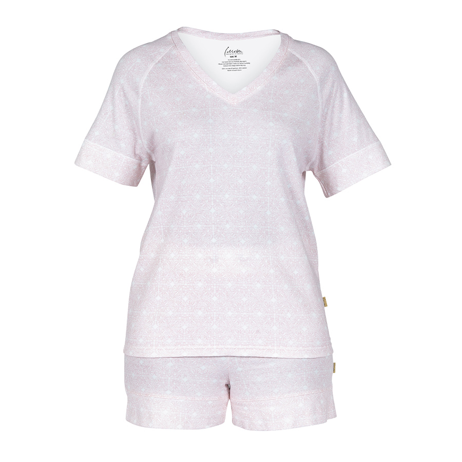 Billie er et deilig pysjsett til dame som består av en kortermet skjorte med v-hals og en shorts med knytting i livet. Settet er svært komfortabelt og kan brukes både om natten og på dagen.