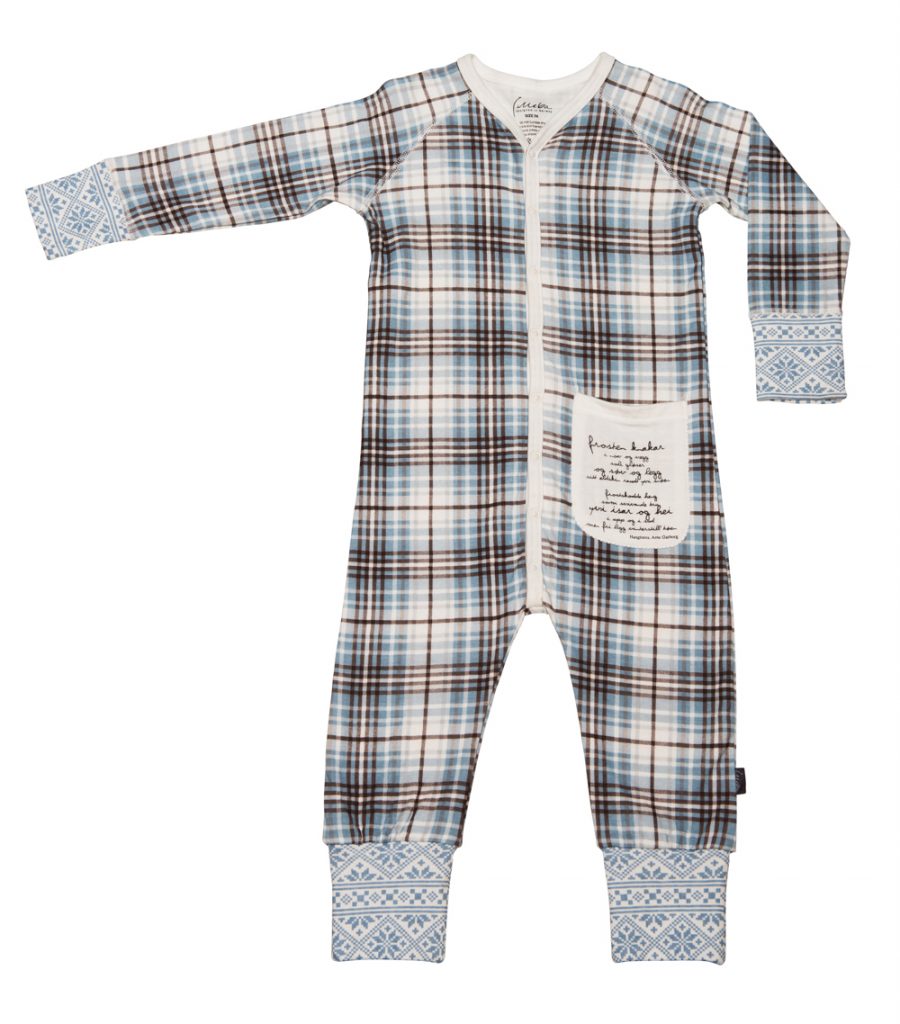 En koselig pysj med klassiske ruter i blått og brunt. Dekorativ lomme med vers fra Arne Garborgs "Sundagsro". Mansjetter i lyseblå strikkestriper. Den har overbrettbare votter i str. 56 og 62 og overbrettbare sokker i alle størrelser. Laget av viskose fra bambus og bomull.